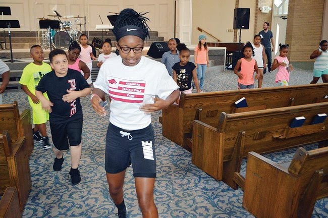 Dance instructor Taylor Conway, 16, leads choreography Wednesday in a MixxedFit class for Summer Impact Camp participants at The Ministry Center in Conway. The healthy choice/risk avoidance camp, sponsored by Choosing to Excel, includes art, dance, reading, field trips and more. Students pictured include, front left, Kayleb Kern, Trinity Lasker of Maumelle, she is clear about what she’s getting out of Choosing to Excel’s Summer Impact Camp.